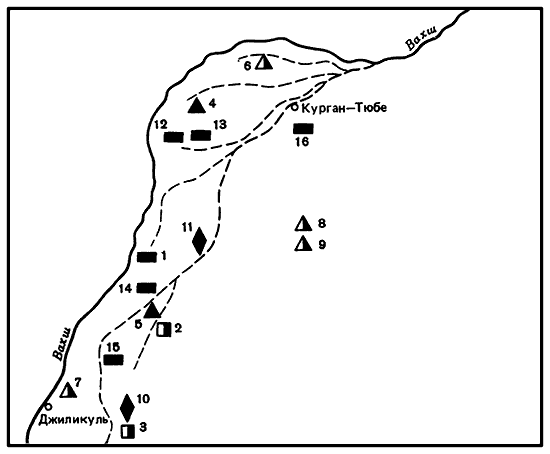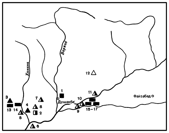 1 – городище в г. Душанбе; 2 – Хоки-Сафед; 3 – Ката-Джелаил; 4 – Хисор; 5 – Тепеи-Гозийон; 6 – Кунябай; 7 – Кампыркала; 8 – Безымянное (23 км от Душанбе); 9, 10 – два безымянных поселения к северу от р. Илак; 11 – Калаи-Шодмон; 12 – Семигандж; 13, 14 – Нагоратепе. Безымянное тепе у с. Ноуабад; 15–17 – группа тепе к северу от р. Илак.