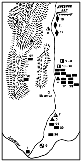 1 – Айвадж; 2, 3 – Калаи-Мир и Кей-Кобад-Шах; 4 – Доккы-Юнус; 5 – Безымянное поселение (к югу от с. Янгиюль); 6 – Хан-Газа; 7 – Безымянное поселение у с. Янгиюль; 8 – Мунчактепе; 9 – оазис у с. Шах; 10, 11 – крепости; 13–16 – Лянгарата, безымянное тепе, Сангова и Тоштепе; 17–23 – Ок-Мазар и шесть безымянных тепе; 24–25 – два тепе; 26 – Чимгалыштепе; 27 – Безымянное тепе; 28 – Актепе.