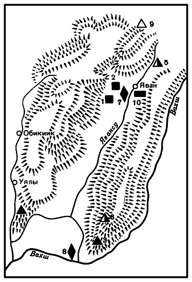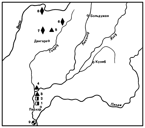 Рис. 13. Памятники Бактрии. Памятники Нижневахшской долины (по Б.Я. Ставискому).
