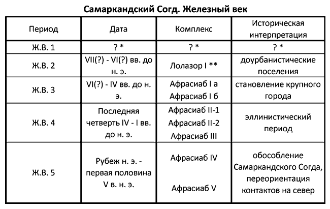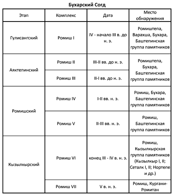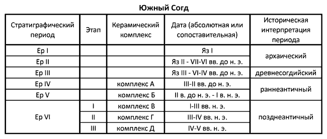 Сравнительно недавно была разработана (на базе главным образом изучения керамики из стратиграфических шурфов) стратиграфическая колонка для Бухарского Согда (Ураков Б., 1982)[56]56