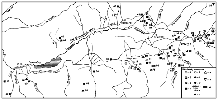 1 – Чуст; 2 – Тергаучи; 3 – Дальверзин; 4 – Ашкалтепе; 5 – Ошское; 6 – Хожамбаг; 7 – Бозтепе; 8 – Дехкан; 9 – Сасык-Бука. Эйлатанская культура; 10 – Эйлатан; 11 – Сымтепе; 12 – Нуртепе; 13 – Ленинабад; 14 – Дашти-Ашт; 15 – Актам; 16 – Кунгай; 17 – Суфан; 18 – Валик; 19 – Тюлейкен; 20 – Озгор; 21 – Керкидон. Шурабашатская культура; 22 – Шурабашат; 23 – Кошбулак; 24 – Карадарьинское; 25 – Карадарьинский оазис; 26 – Дунбулак; 27 – Хожамбагтепе; 28 – Мирзалимтепе; 29 – Мады; 30 – Шоштепе; 31 – Кулунчак I; 32 – Кулунчак II; 33 – Айрымачтау; 34 – Араван; 35 – Наукат; 36 – Абшир-Сай; 37 – Саймалыташ. Мархаматская культура; 38 – Мархамат; 39 – Мунчактепе; 40 – Гайраттеие; 41 – Биловуртепе; 42 – Кайноват; 43 – Кызыл-Джар; 44 – Куюктепе; 45 – Кугай; 46 – Касан; 47 – Тудаи-Хурд; 48 – Тудаи-Калон; 49 – Кара-Камарское; 50 – Кайрагач; 51 – могильник Кайрагач; 52 – могильник Карабулак; 53 – Баткенское; 54 – Отукчп; 55 – Мыктыкурган; 56 – Джилгин-Сай; 57 – Янги-Базар; 58 – могильник Кайноват; 59 – могильник Кувинский; 60 – могильник Коштепинский; 61 – могильник Кува-Сай; 62 – могильник Темир-Коруг.