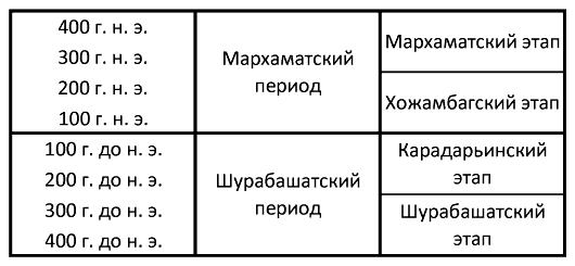 Автор данного раздела полагает, что на смену эйлатанскому периоду приходит шурабашатский, затем сменяемый мархаматским. При этом мы исходим из того, что есть возможность наметить и более дробную периодизацию, хотя в издании такого типа, как «Археология СССР», рассматривать по этим дробным этапам (учитывая условность границ и недостаток материалов) еще нельзя. Предлагаемая периодизация выглядит следующим образом: