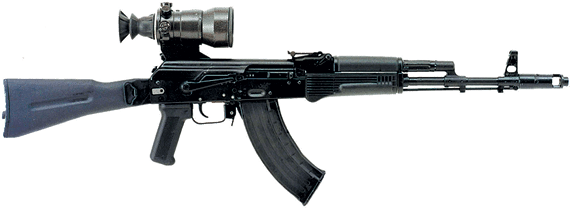 • АКС-74УН. На левой стороне ствольной коробки автомата имеется присоединительная планка, на которой может быть закреплен прицел ночного видения. Ижевский механический завод выпустил партию таких автоматов с прицелом НСПУ. Возможна установка прицелов НСПУМ и КАНАДИТ-О. Известна также модификация автомата, у которой цевье, ствольная накладка и рукоятка управления огнем изготовлены из стеклонаполненного полиамида. Масса этого автомата без патронов составила 2,68 кг.