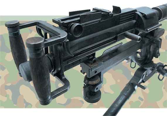 На стволе перед обоймой закреплена рукоятка для переноски пулемета, служащая и для смены разогретого ствола.