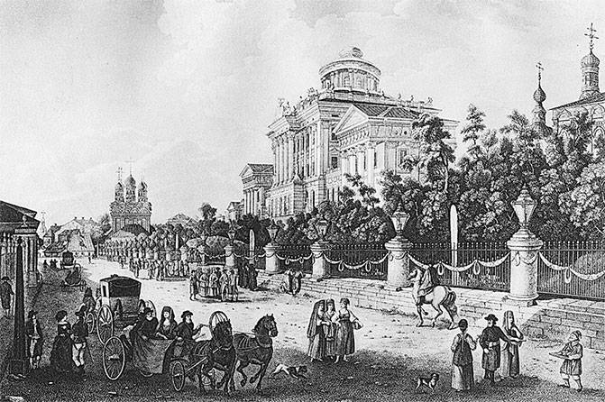Дом Пашкова. Гравюра Ф. Б. Лорье с картины Ж. де ла Барта, 1795. Из книги «Архитектурные памятники Москвы», 1904