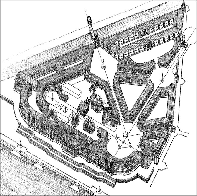 Чтобы понять масштаб задачи, нужно представить себе Кремль тех времён. Соборная площадь в окружении Грановитой палаты и нескольких храмов, построенных итальянскими и русскими зодчими. Здания Арсенала и Потешного дворца. А на остальной территории теснились «в живописном беспорядке» монастыри, здания приказов и боярских палат… Каким волшебством можно было всё это гармонизировать?..