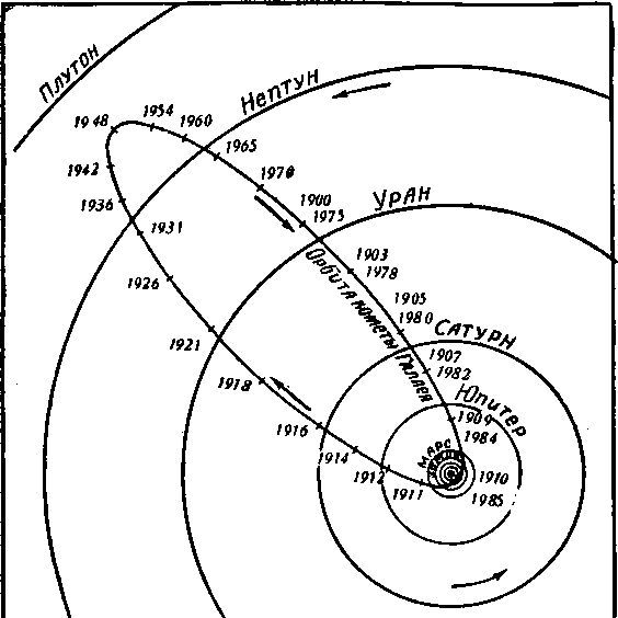 Правда, далеко не все кометы движутся вокруг Солнца по замкнутым орбитам. Есть и такие, которые приходят к нам откуда-то из межзвездных пространств с тем, чтобы, «сверкнув хвостом», безвозвратно исчезнуть в глубинах Вселенной. Подобных «небесных странниц» зарегистрировано около трехсот. Однако имеющиеся в распоряжении ученых данные говорят о том, что и эти кометы когда-то также были периодическими. Они тоже обращались вокруг Солнца, но затем под действием притяжения больших планет изменили характер своего движения. Однако влияние планет на кометные орбиты – явление реальное, вполне поддающееся, хотя и с известными трудностями, точному расчету. К тому же почти все кометы, принимавшиеся людьми за «небесные знамения», как раз являлись периодическими; более того, в большинстве случаев это была все одна и та же комета Галлея.