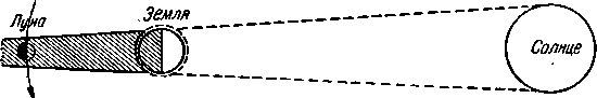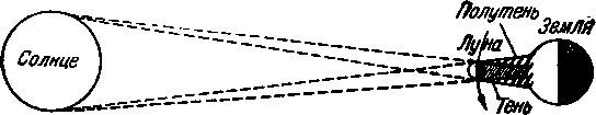 Что же касается солнечных затмений, то они происходят тогда, когда Луна, проходя между Землей и Солнцем, в свою очередь отбрасывает тень на поверхность Земли. Поперечник Луны в четыреста раз меньше поперечника Солнца, но зато Солнце находится в четыреста раз дальше от нас, чем Луна. Поэтому маленькая Луна может полностью заслонить гигантское Солнце, подобно тому как ладонью руки мы можем заслонить от глаз далеко стоящий дом или даже целую гору.
