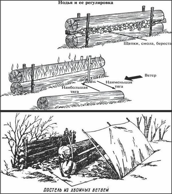 Разгоревшись, такая конструкция горит очень долго, несколько часов – не надо просыпаться и подбрасывать топливо. Полыхает нодья не слишком жарко, и тепло за счет ее вытянутой формы равномерно распределяется вдоль тела лежащего рядом человека. А чтобы другой бок не мерз, там под углом натянут брезентовый тент, он отражает идущее тепло обратно, и оно согревает спящего с другой стороны. Снизу теплоизоляцию обеспечивает толстый слой елового лапника. Есть еще кое-какие тонкости, но не будем в них вдаваться, общий принцип уже понятен.