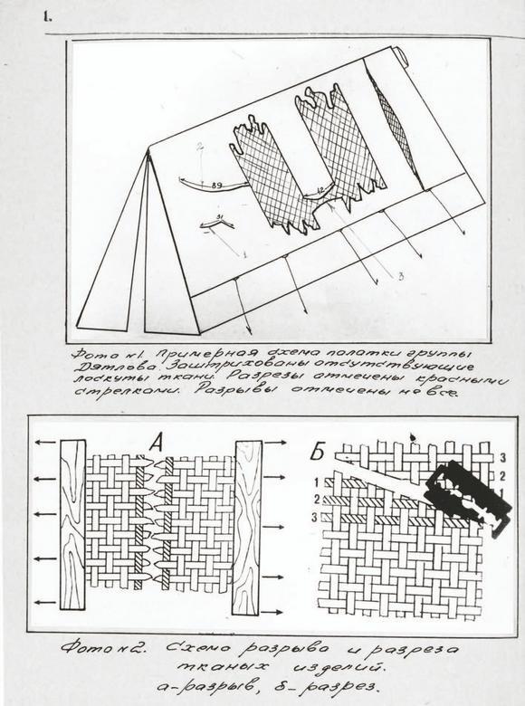 Рассмотрим схему повреждений палатки, нарисованную экспертом тов. Чуркиной, повнимательнее. Та, конечно, не Левитан, но главное отразила: палатка не просто разрезана, она лишилась двух приличных кусков брезента. Отсутствуют. Напрочь вырезаны. Хотя, по логике вещей, если режешь палатку, чтобы побыстрее из нее выбраться, достаточно всего лишь длинного вертикального разреза. Края его разойдутся и можно будет протиснуться наружу. И такой разрез на палатке есть – на рисунке он справа, тянется от конька крыши до места крепления крайней растяжки.