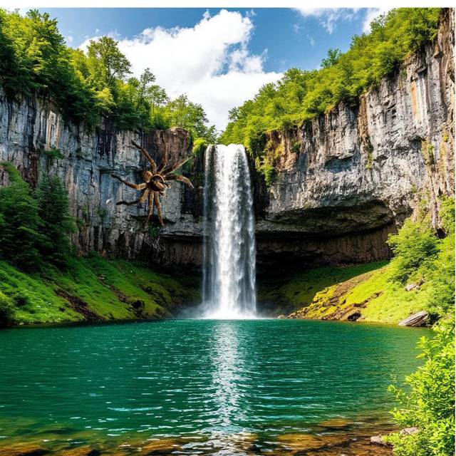 Сын тут же вывел на экран кадр из моей съемки, где на скале, что возвышалась возле водопада, завис огромный, раскинувшийся на отвесной скале, на несколько метров серо-коричневый паук. От неожиданности, я вскочил со своего места, и выглянул в дверь, в последний момент заметив, как это самое чудовище, добралось до верхней кромки скалы, и перебравшись через нее исчезло из моего поля зрения. Хотя паук и уполз, на всякий случай, ту же закрыл верхний люк фургона, и все проемы, оставив только форточку, затянутую москитной сеткой. Как я его не заметил раньше, купаясь в водоеме, было непонятно.