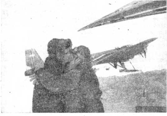 Одним улетать, другим оставаться. (Э. Т. Кренкель прощается с участником экспедиции, отлетающим с дрейфующей станции.)