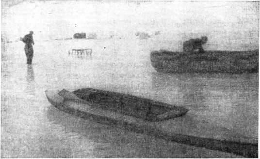 Торопились спасать склады, их совсем залило. По колено в воде, балансируя по проложенным доскам, тащили бидоны с продовольствием, тюки, волокли мешки с керосином. Развязывать веревки было некогда. Петр Петрович выстрелом из пистолета рассекал крепкие морские узлы. Все укладывали на нарты, и, впрягшись, вытягивали на более высокое место. На мокром снегу ноги скользили, разъезжались. И без того тяжелый груз становился непосильным.