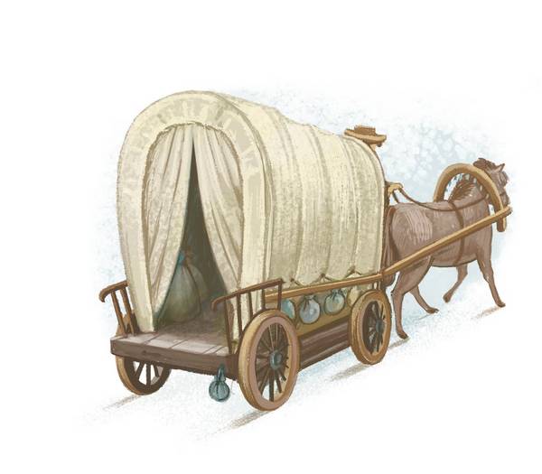 Она указала на повозку, запряжённую маленькой лошадкой, которой правил полный румяный старичок в жёлтом картузе, рубахе и просторных штанах, заправленных в чёрные поношенные сапоги. Юма заметила многочисленные аккуратные кармашки на его одеянии, застёгнутые железными пуговками.
