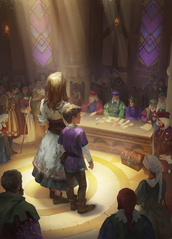Через несколько улиц троица остановилась у дома, возвышающегося над всеми остальными городскими строениями. Провожатый спешился и жестом пригласил пройти внутрь. Вход в здание был высоким, и дети зашли не пригибаясь. Внутри оказался украшенный фресками круглый зал. Вдоль его стен на скамейках расположились местные жители. Пространство освещали факелы, закреплённые на четырёх витых колоннах, поддерживающих свод.