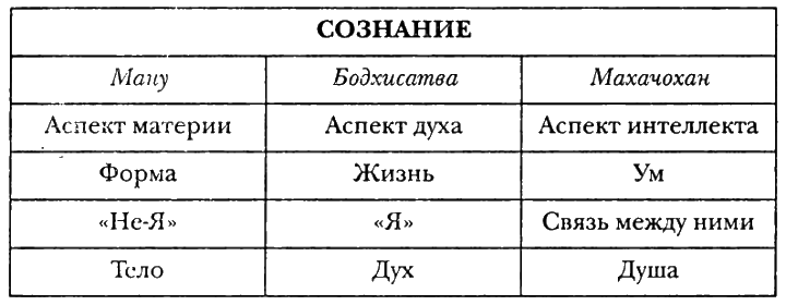 Все человеческие существа относятся к тому или иному из этих трех департаментов, и все эти департаменты абсолютно равнозначны, так как дух и материя суть одно. Являясь выражением единой жизни, они настолько взаимозависимы, что попытки как-то разделить и систематизировать их функции с помощью таблиц и схем, как это делаем мы ради внесения большей ясности для логически ориентированного ума читателей, могут привести к ошибочным представлениям.