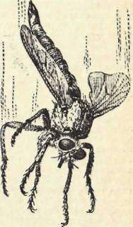 Одни виды ежемух откладывают яички прямо на растения, в местах обитания нужных им гусениц, и вышедшие, из яиц личинки тахин находят их сами. Другие виды наклеивают яйца прямо на покровы «хозяина». Мне не раз приходилось находить гусениц с плотно приклеенной к ней кучкой тахиньих яиц – отделить их не удавалось ни иглой, ни скальпелем, не рискуя прорвать шкурку гусеницы. Многие виды ежемух приклеивают яйца в воздухе – на летящего «хозяина». Интересную погоню тахин за взлетающими кобылками описал профессор П. И. Мариковский в своей книге «Друзья-насекомые». А мне удалось в микрозаповеднике под Новосибирском сфотографировать даже такую сценку: на пальце моей левой руки сидит ктырь, закусывающий какой-то пойманной им мухой (выставленным мною нарочно пальцем он воспользовался как посадочной площадкой), а рядом, на том же пальце, караулят его две маленькие тахинки, преследовавшие его повсюду с явным намерением отложить на него яйца – скорее всего тоже на лету. Рисунок с этой любопытной и редкой фотографии – на этой странице.