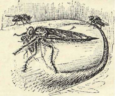 Но вот еще один «удар» в небо, на этот раз удачный, – и бравый охотник садится на столб с добычей. В лапах у него – пилильщик, небольшое насекомое из отряда перепончатокрылых (личинки пилильщиков питаются растениями). Бедняга уже мертв: еще на лету ктырь вонзил в него свой твердый кинжалообразный хобот, впрыснул яд. Яд ктырей, кстати, очень сильный: если схватишь такую крупную муху рукой, то пленник может пребольно ужалить, да так, что жгучая боль заставит немедля его выпустить.