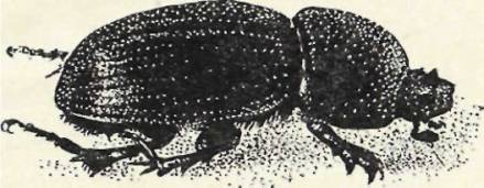 Летом на степных пастбищах, по краям подсохших лепешек коровьего помета можно увидеть бугорки вырытой земли. Это – следы подземных работ жуков-навозников разных видов, своего рода терриконы. Шестиногие шахтеры, готовя подземные жилища для своего потомства, «выдают на-гора» изрядное количество земли. Довольно крупные отвалы принадлежат самому большому навознику Западной Сибири – геотрупу, черному яйцевидному жуку, отливающему, особенно снизу, красивым синим или зеленым блеском. Снимешь аккуратно подсохшую корку с коровьей лепешки – неподалеку от «террикона» увидишь круглый ствол жучиной шахты, аккуратно обработанный, широкий – в него свободно входит палец. Если отвал свеж, то с помощью лопатки или ножа можно, не поленившись, докопаться и до самого жука – одного из героев замечательных очерков Фабра.