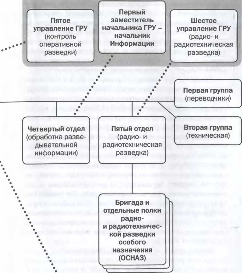 Пятая группа занималась радио– и радиотехнической разведкой. В подчинении этого отдела находился полк ОСНАЗ; кроме того, отдел управлял радиоразведкой подчиненных дивизий.