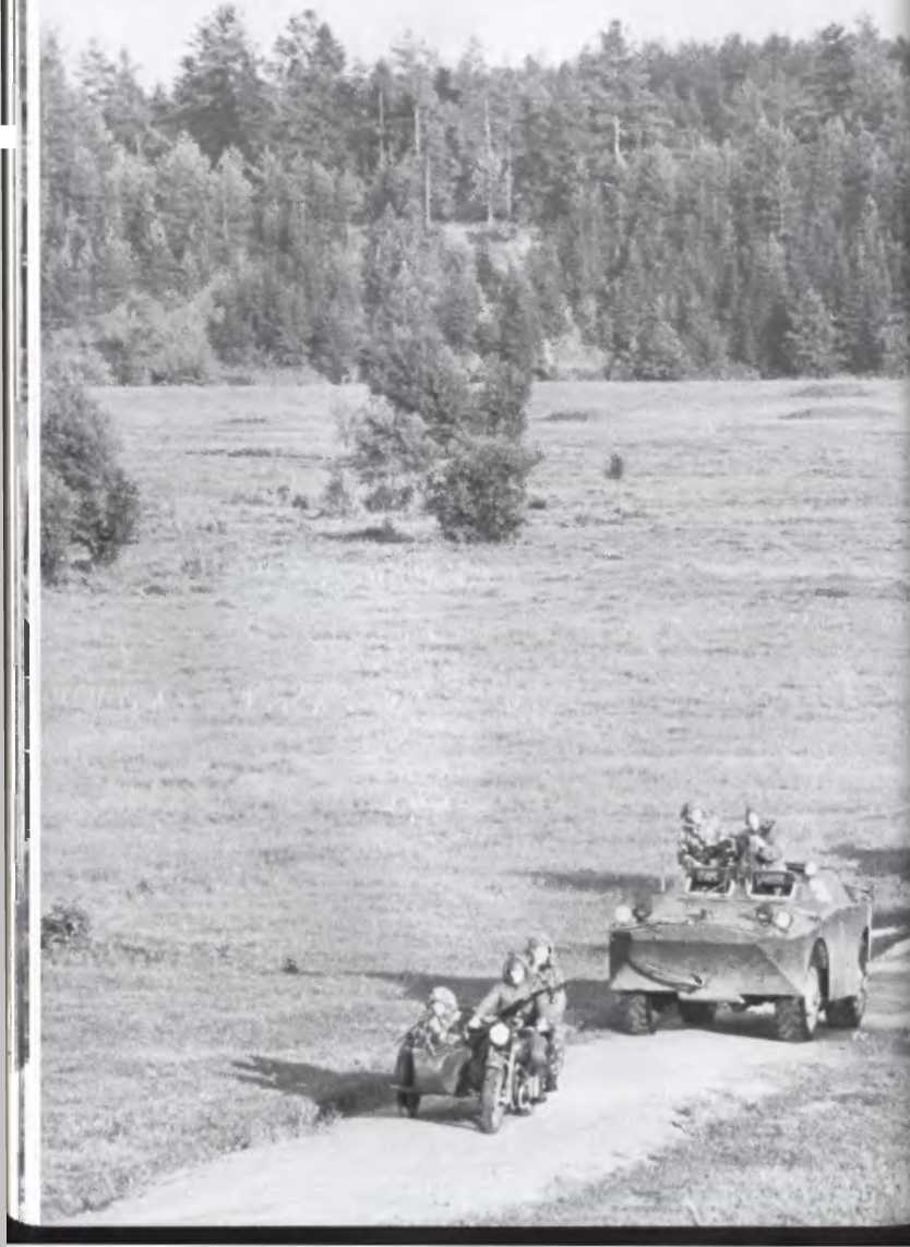 Бойцы разведывательной роты отдельного разведывательного батальона дивизии Советской Армии на мотоцикле и БРДМ на учениях ведут разведку переднего края обороны условного противника (1970 год).
