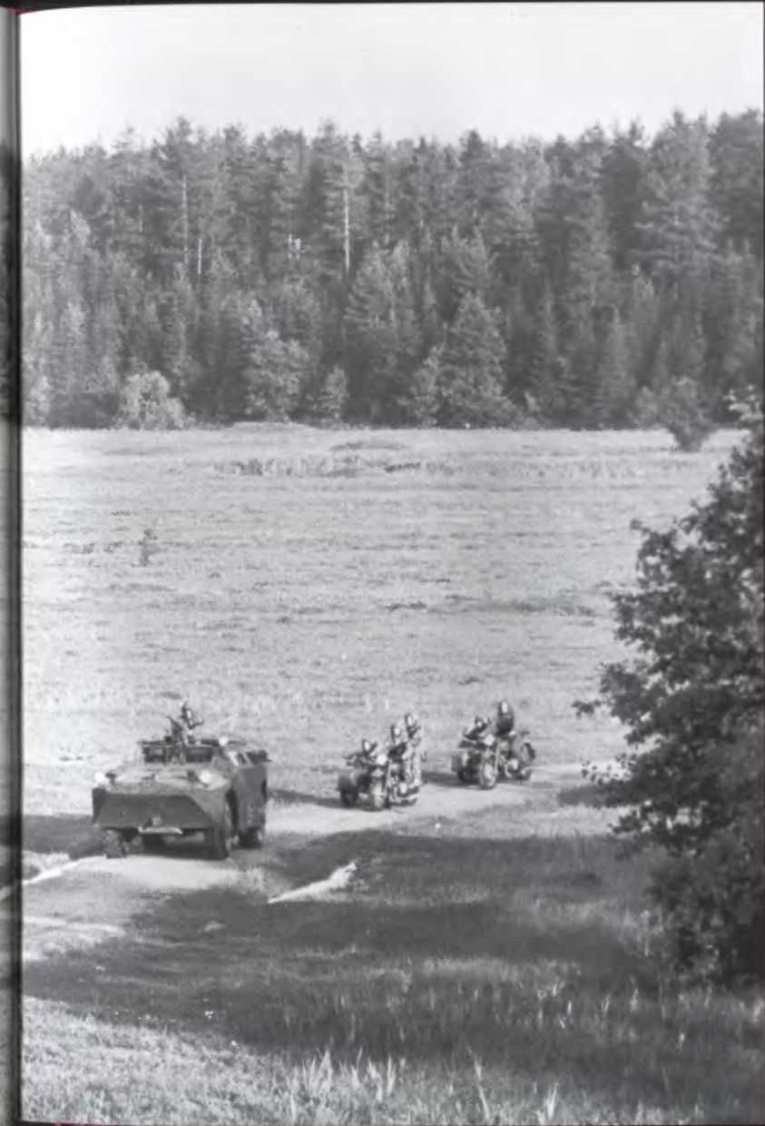 Бойцы разведывательной роты отдельного разведывательного батальона дивизии Советской Армии на мотоциклах и БРДМ выдвигаются на разведку на учениях (1970 год).