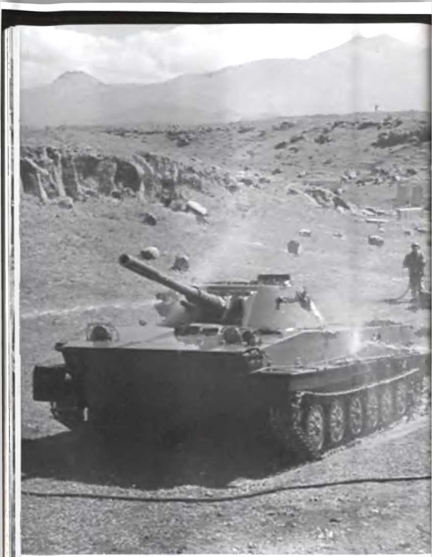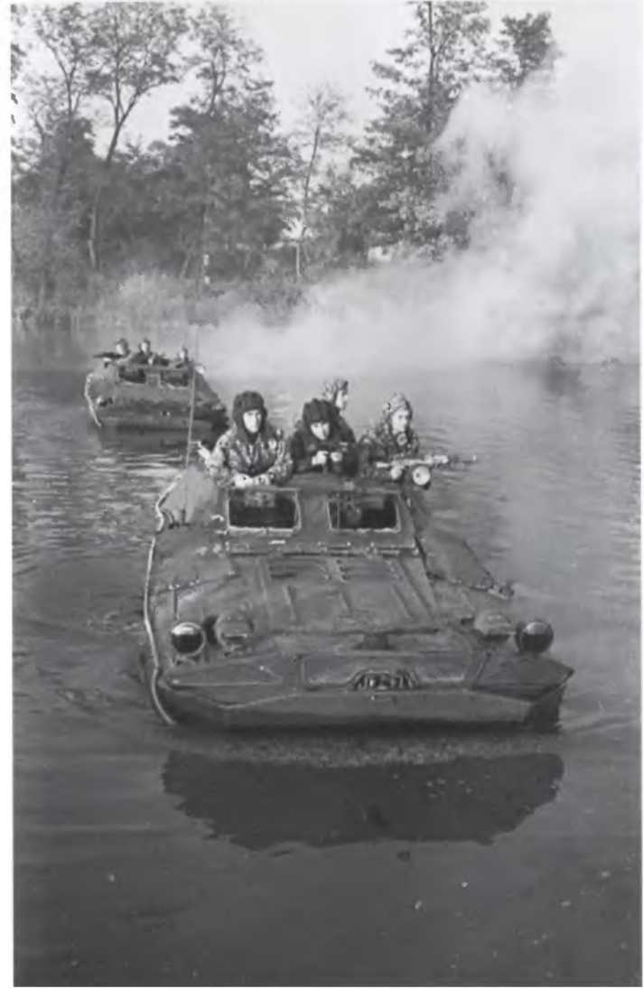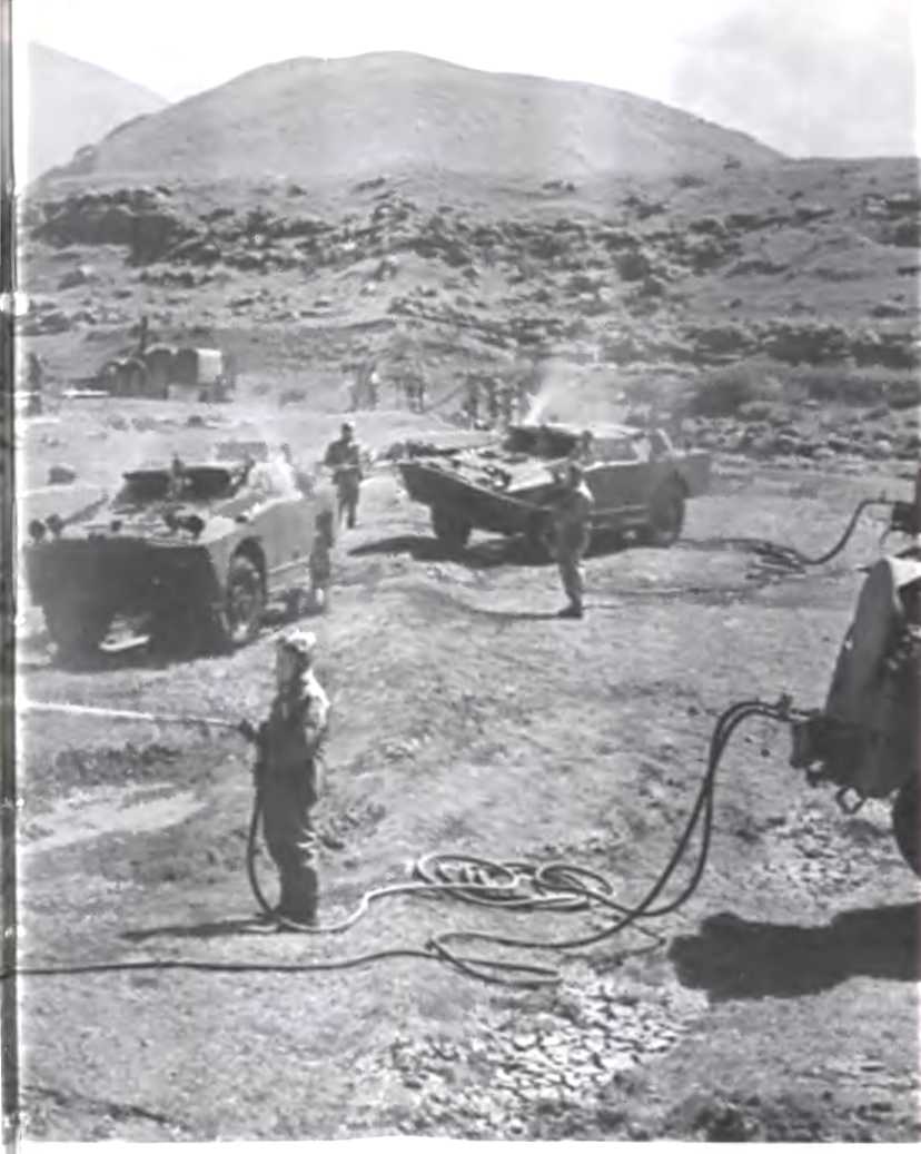 Дезактивация и дегазация боевых машин (плавающий танк ПТ-76 и БРДМ) разведывательной роты отдельного разведывательного батальона дивизии Советской Армии на учениях (1966 год). Как показали учения советских войск на Тоцком полигоне с применением ядерного оружия 14 сентября 1954 года, советское руководство разрабатывало планы вторжения в Западную Европу, которые предусматривали использование ядерного оружия для прорыва обороны противника. В соответствии с этими планами разведывательные подразделения, двигаясь в авангарде наступающих частей Советской Армии, должны были действовать в зонах радиоактивного заражения, поэтому действия по защите от поражающих факторов ядерного взрыва отрабатывались в советских разведывательных частях очень серьезно.