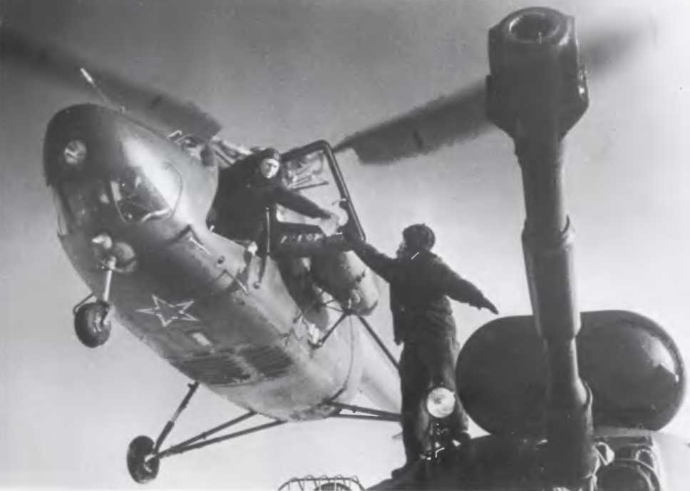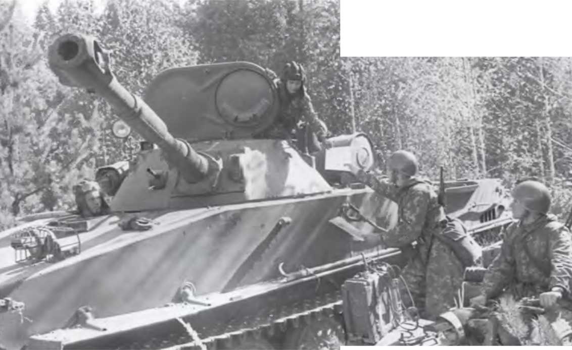 Командир танкового взвода разведывательной роты старший лейтенант Крылов передает карту с разведывательной информацией вертолетчику старшему лейтенанту Шевцову с борта плавающего танка ПТ-76 (1960-е годы).