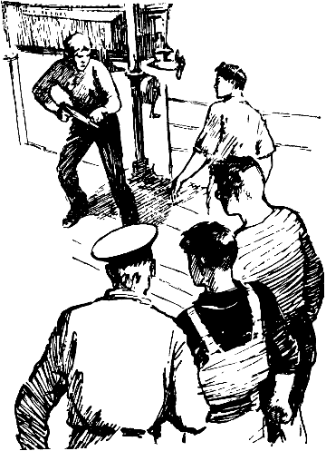 Я стою за его спиной. Преимущества такого положения очевидны. Ни нож, ни весло от шлюпки не спасут его, потому что не успеет замахнуться. А рядом пятеро здоровых ребят.