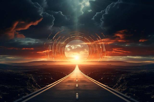 Пустынное полотно автотрассы, слабо освещенное закатом, словно бы исказилось перед автомобилем, неестественно изгибаясь и меняя свои очертания. Прямо посреди дороги, внезапно, вспыхнуло и стало стремительно разрастаться белое пламя, приобретая вид огромного огненного круга.
