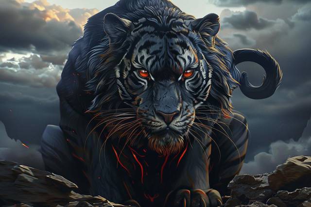 Был он огромен, размером не меньше тигра, но статью походил скорее на леопарда, а короткая грива напоминала льва. Серый никогда не видел ничего подобного. Шерсть зверя была черна, словно покрытое тучами небо в безлунную ночь. Только на морде над глазами проступали небольшие белые пятна. В приоткрытой пасти зверя видны острые белые клыки.