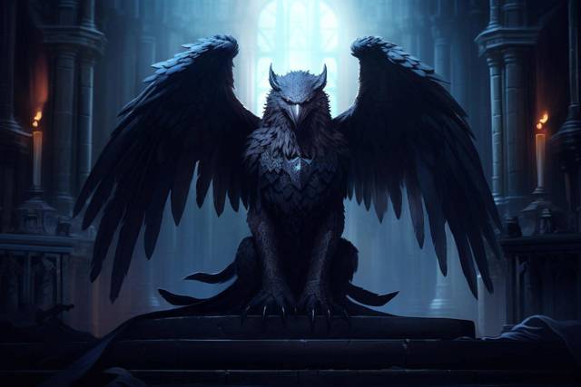 Большое помещение было тёмным, суровым и практически пустым. Из высоких узких окон наискось падал слабый свет, освещая каменный пол и серые стены. В простенках меж окон стояли массивные книжные шкафы с пустыми полками. В самом его центре было воздвигнуто некое возвышение, типа постамента, на котором сидел огромный грифон. Серый мгновенно вспомнил каменных зверей возле моста.
