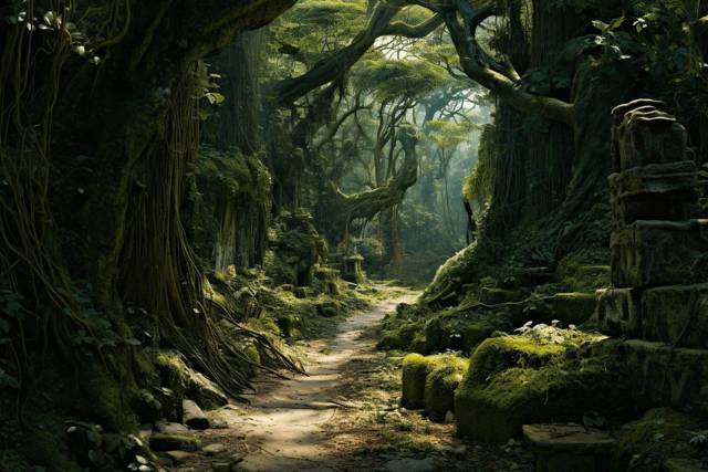 Копыта коня звонко цокали по шестиугольным каменным плитам, пока команда дружно смотрела по сторонам. В этих местах не ощущалось древней жути, но лежала невидимая печать запустения. Некогда здесь, видимо, был дворец или большой обширный храм, застроенный красивыми каменными строениями, но сейчас всё пришло в негодность. Заросли наступали на дома и почти поглотили их под собой. Из зелени выступали стройные мраморные колонны, заросшие, обвитые длинными лианами.