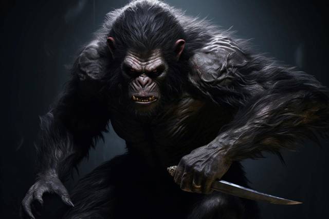 На полу перед конём лежала обезьяна. Заметно больше Макса, по размерам больше похожая на небольшого человека. Совершенно голая. Заросшая черной шерстью. В оскаленной пасти виднелись клыки. И, да, несомненно мужского пола. Единственным предметом одежды был пояс с ножнами.