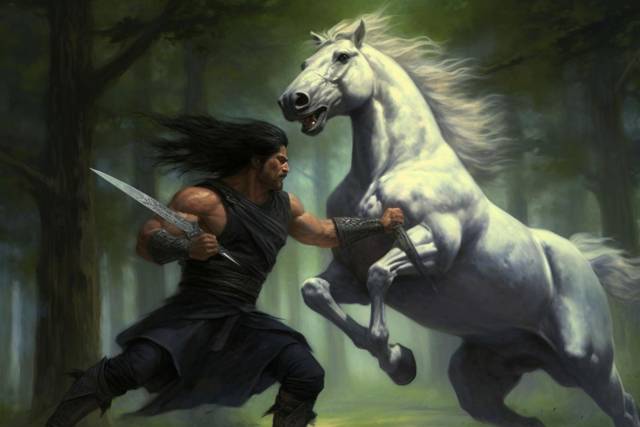Серый ожидал очередного мотания головой, но реакция оказалась парадоксальной. Глаза человека дико расширились. С отчаянным воплем «йаааа!» пленник выхватил здоровой рукой кинжал и воткнул его коню в ногу.