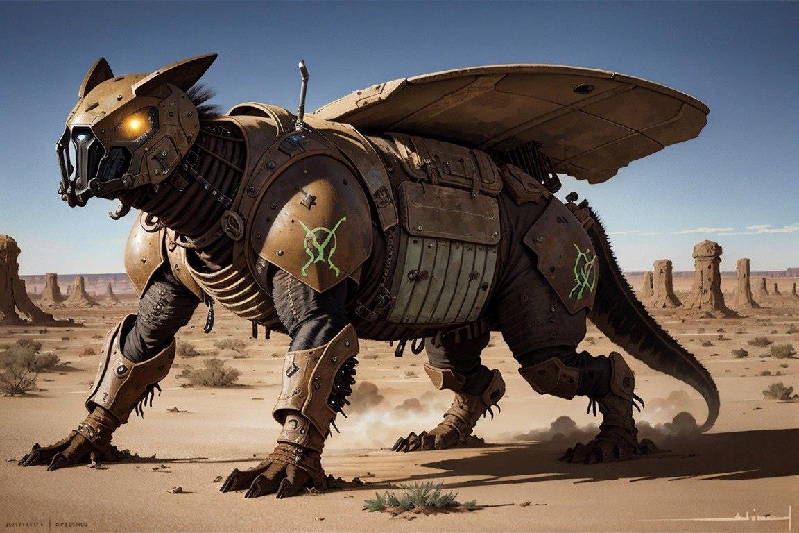 Примерно через пару километров глазам людей открылось сухое речное русло. По берегам торчали тёмные, безлистые остовы мёртвых деревьев. Возле зловещей рощи застыл странный транспорт – механический шагоход со светящимися глазами на металлической морде. Он походил по очертаниям сразу на лошадь, собаку и ящера. Толстые, тусклые от пыли крылья робота-химеры торчали в стороны, словно у самолёта.