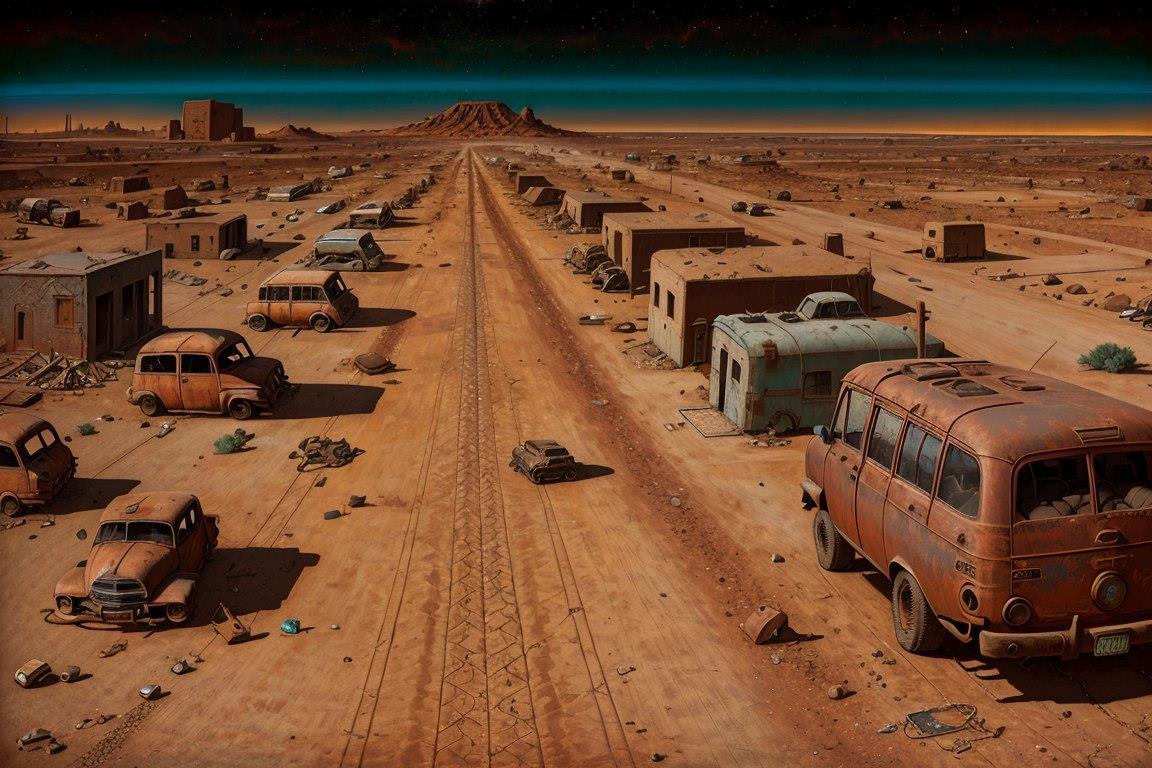 С обрыва внизу виднелась прямая, как стрела, дорога. По обеим сторонам от неё рядами выстроились трейлеры и автомобильные остовы без колёс.