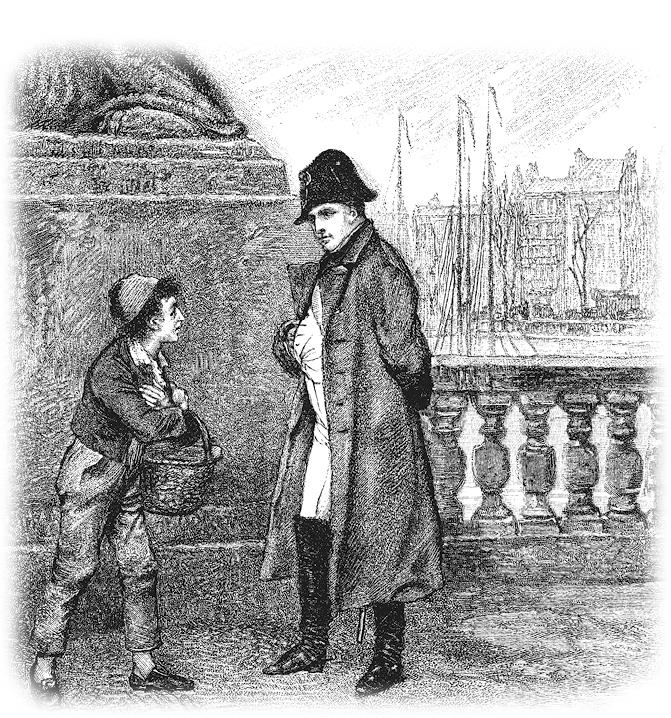 Но однажды Альмансор шёл по одному из тех мостов, которые ведут через широкую реку, протекающую по городу. Там он заметил человека в простом солдатском платье, прислонившегося к перилам моста и смотревшего на волны. Черты этого человека бросились ему в глаза, и он вспомнил, что уже видел его. Поэтому он быстро порылся в своих воспоминаниях, и когда вспомнил о событиях в Египте, ему вдруг стало ясно, что этот человек – тот полководец франков, с которым он в лагере часто говорил и который всегда милостиво заботился о нем. Альмансор точно не знал его настоящего имени, поэтому он собрался с духом, подошёл к нему, назвал его так, как его называли между собой солдаты, и сказал, скрестив по обычаю своей страны руки на груди: