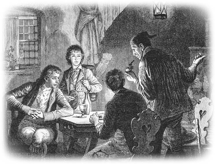 Она обещала подать им ужин и приготовить постели. Они вошли в дом и, положив в угол свои тяжёлые узлы, палки и шляпы, сели за стол подле господина. Последний на их поклон привстал, и они увидели изящного молодого человека, дружелюбно ответившего на их приветствие.