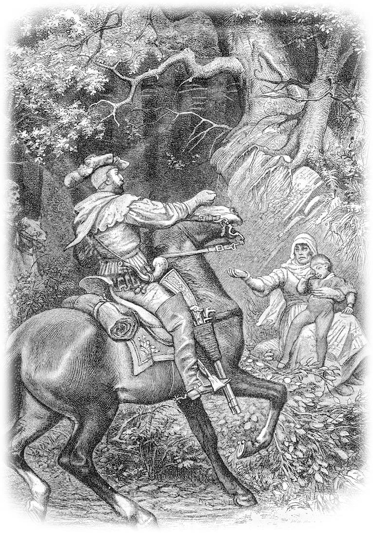 Хотя граф фон Цоллерн был суровым и угрюмым человеком, но это зрелище потрясло его душу. Он подумал, что его сын расшибся и лежит где-нибудь на дороге. Он схватил себя за бороду и зарыдал. Но как далеко он ни возвращался, нигде не было видно следа мальчика. Он уже решил, что испуганная лошадь сбросила его в канаву с водой, которая была около дороги. Вдруг он услыхал сзади себя, что детский голос выкрикивает его имя, и когда быстро обернулся – что же! Недалеко от дороги, под деревом, сидела старая женщина и на коленях качала мальчика.