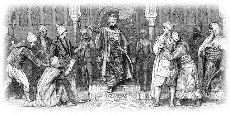 Бенезар, почти обессилев от радости, бросился в объятия своего пропавшего сына. Тогда калиф с суровым видом спросил: