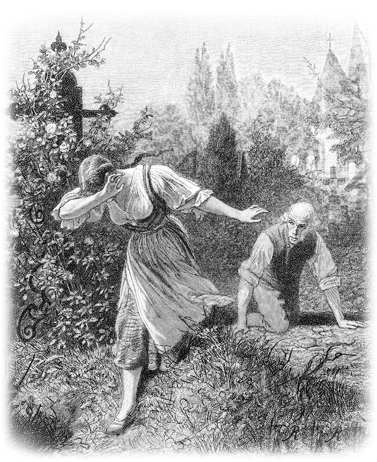 Она перешла через несколько известных ей могильных холмов, но чем ближе стала подходить к белым розам на могиле Кетхен и к могиле страшного торговца, тем ей делалось всё страшнее и страшнее. Наконец она была там. Дрожа она опустилась на колени и начала рвать розы. Вдруг ей показалось, что совсем близко она слышит какой-то шорох. Она оглянулась: в двух шагах от неё из одной могилы вылетала земля и оттуда медленно поднималась какая-то фигура. Это был старый бледный человек. Сестра перепугалась. Она взглянула ещё раз, чтобы убедиться, действительно ли она видит это. Когда же стоявший в могиле гнусавым голосом проговорил: «Добрый вечер, девушка! Откуда ты так поздно?», её охватил смертельный ужас. Она вскочила и бросилась бежать по могилам домой. Еле дыша она рассказала виденное и так ослабела, что домой её пришлось переносить. Что было для нас пользы в том, когда на другой день мы узнали, что это был могильщик, который рыл там могилу и обратился к моей сестре? Прежде чем она могла узнать об этом, её охватила горячка, от которой она через три дня умерла. Да, роз на свой погребальный венок она нарвала сама.