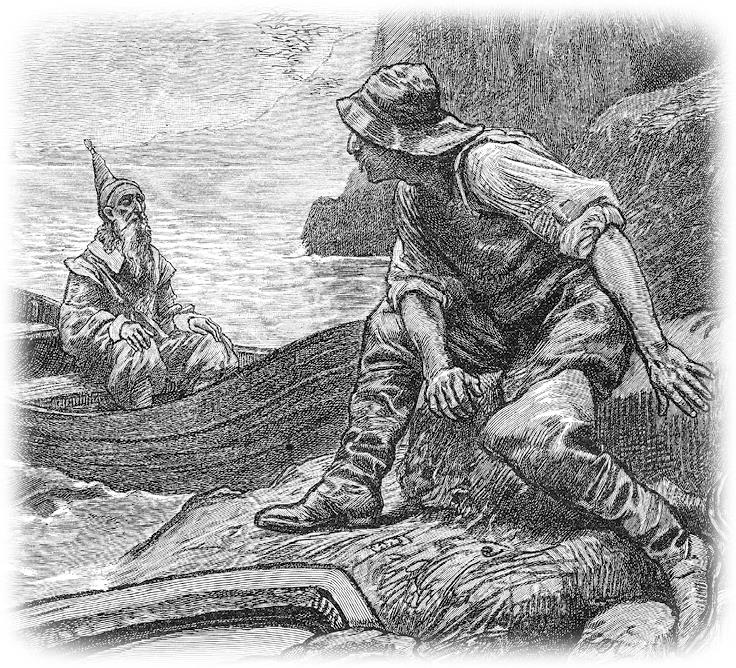Когда Фальке проснулся, первые лучи восходящего солнца падали на спокойное теперь зеркало моря. Он уже хотел опять приняться за обычную работу, как увидел, что издали что-то подходит к нему. Скоро он узнал лодку и в ней человеческую фигуру. Но что возбудило его величайшее изумление, так это то, что судно подвигалось вперёд без парусов или весел, хотя носом было направлено к берегу, причём сидевшая в нем фигура нисколько, казалось, не заботилась о руле, если и был вообще руль. Лодка подходила всёближе, и наконец судно остановилось около Вильгельма. Человек, сидевший в нем, оказался маленьким, сморщенным, старым карликом, одетым в жёлтое льняное платье, в красный торчащий кверху ночной колпак, с закрытыми глазами и неподвижный, как высохший труп. Напрасно окликнув и толкнув его, Вильгельм уже хотел прикрепить к лодке верёвку и отвести её, как человек открыл глаза и начал шевелиться, но так, что это навело ужас даже на смелого рыбака.