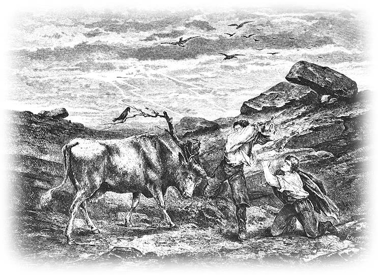 Это было в сентябре, и длинные ночи долгой шотландской зимы уже начались. Ночные облака тяжело катились от сурового вечернего ветра и нагромождались, как ледяные горы в Мальстреме, глубокий мрак наполнял ущелья между горами и сырыми торфяными болотами и мрачные русла потоков смотрели черно и страшно, как адские пасти. Фальке шёл впереди, а Штрумпф следовал за ним, дрожа от своей смелости, и слезы наполняли его грустный взор всякий раз, как он смотрел на бедное животное, которое с таким полным доверием и бессознательно шло навстречу своей скорой смерти; она должна была достаться ему от руки, доставлявшей ему до сих пор пропитание. С трудом вошли они в узкую, болотистую горную долину, местами поросшую мхом и вереском, усеянную большими камнями и окружённую дикой горной цепью, которая терялась в седом тумане и куда редко поднималась человеческая нога. По зыбкой почве они приблизились к большому камню, который стоял посредине и с которого с криком полетел в вышину испуганный орёл. Бедная корова глухо заревела, как будто сознавая ужас этого места и предстоявшую ей участь. Каспар отвернулся, чтобы вытереть у себя быстро потёкшие слезы. Он взглянул вниз на отверстие в скале, через которое они взошли и откуда слышен был отдалённый шум прибоя, а затем они поднялись на вершины гор, окружённые черным как уголь облаком, из которого время от времени слышно было глухое рокотание. Когда Каспар опять оглянулся на Вильгельма, последний уже привязал бедную корову к камню и стоял с поднятым вверх топором, собираясь убить доброе животное.