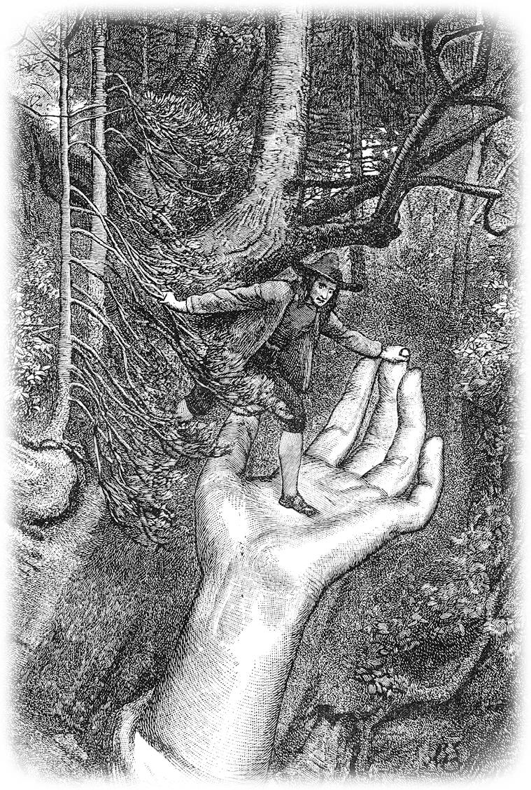 Дрожа от страха, Петер исполнил приказание: поместился на ладони и изо всех сил ухватился за большой палец великана.