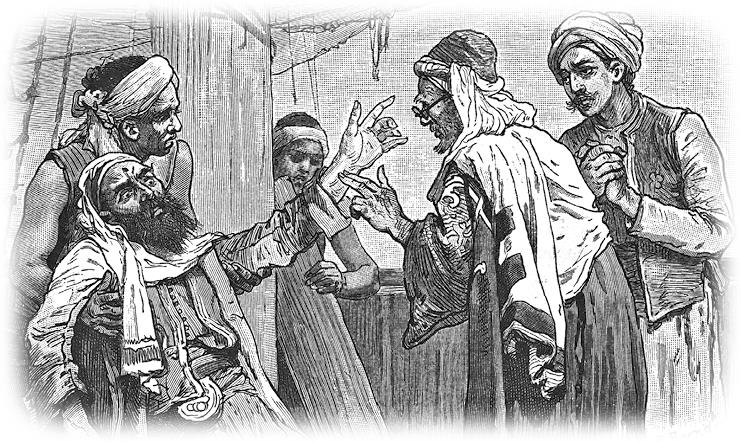 В доме навстречу ко мне вышел старый человечек с седой бородою и длинным носом. Он спросил, что мне надо. Я сказал ему, что ищу мудрого Мулея, и он отвечал мне, что это он сам. Я спросил у него совета, что мне сделать с мертвецами и как мне взяться за дело, чтобы снять их с корабля. Он отвечал мне, что люди на корабле, вероятно, заколдованы за какое-нибудь злодеяние относительно моря. Он думает, что колдовство будет разрушено, если принести их на землю, а это можно сделать только вырвав доски, на которых они лежат. По всей правде и справедливости корабль вместе со всеми товарами принадлежит мне, потому что я, так сказать, нашёл его, но я должен всё держать в большой тайне и сделать ему от своего избытка маленький подарок. За это он своими рабами поможет мне убрать мертвецов. Я обещал щедро наградить его, и с пятью рабами, снабжёнными топорами и пилами, мы отправились в дорогу. По дороге волшебник Мулей очень хвалил нашу счастливую выдумку обёртывать паруса изречениями Корана. Он сказал, что это было единственным средством нашего спасения.