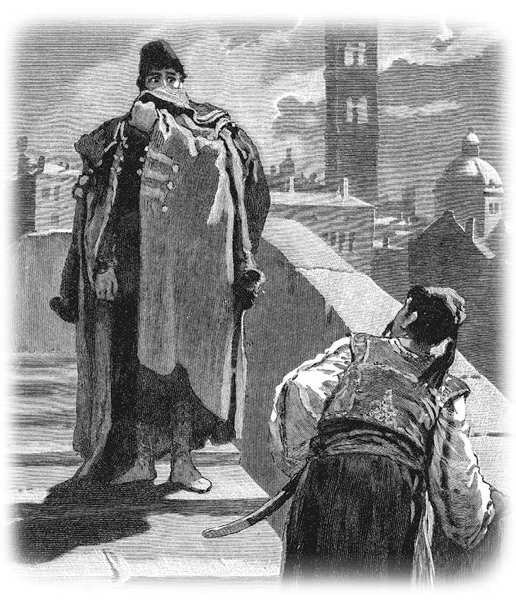 Когда время подходило близко к полуночи, я отправился в путь и скоро пришёл на Ponte Vecchio. Я нашёл мост покинутым и пустынным и решил ждать, пока не явится тот, кто звал меня. Ночь была холодная; светила ясная луна, и я стал смотреть вниз на волны Арно, далеко блиставшие при лунном свете. Вот на городских церквях пробило двенадцать часов. Я выпрямился – передо мной стоял высокий человек, совершенно закутанный в красный плащ, край которого он держал перед лицом.