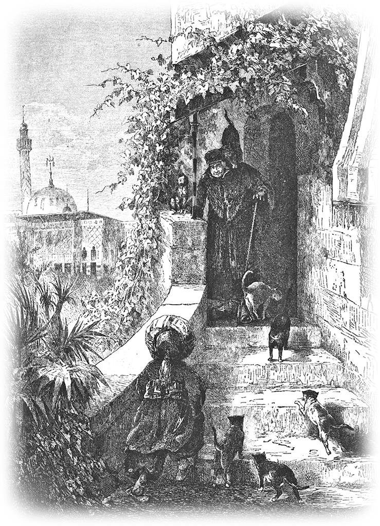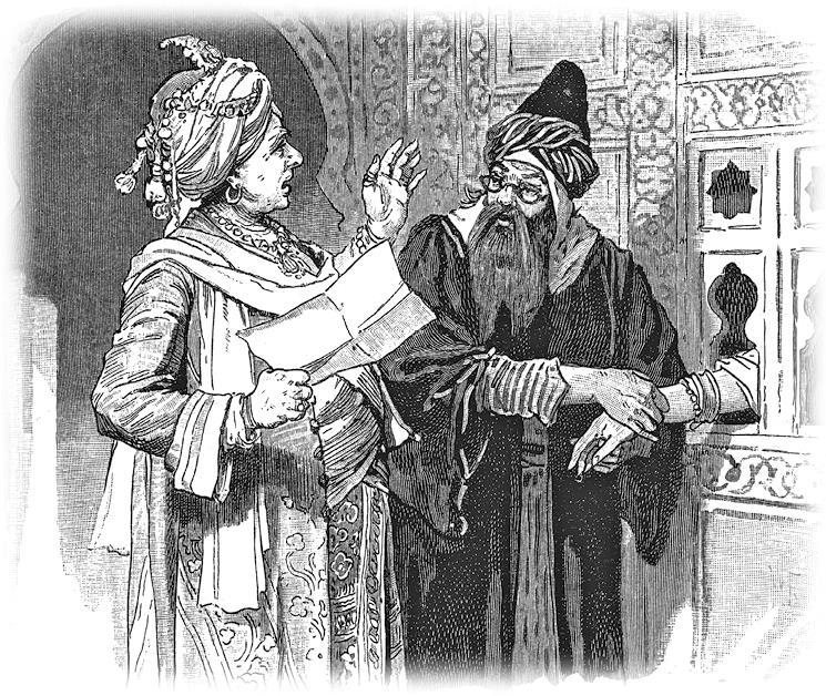 Приехав к Тиули, он велел доложить о себе как о враче Хакаманкабудибабе, и случилось так, как он рассчитывал. Чудесное имя чрезвычайно отрекомендовало его старому дураку, так что он тотчас пригласил его к обеду. Хакаманкабудибаба явился к Тиули, и старик, побеседовав с ним едва час, решил подвергнуть лечению мудрого врача всех своих рабынь. Мустафа едва смог скрыть свою радость, что теперь опять увидит возлюбленную сестру, и с бьющимся сердцем последовал за Тиули, который повёл его в сераль[18]. Они пришли в прекрасно убранную комнату, в которой, однако, никого не было.
