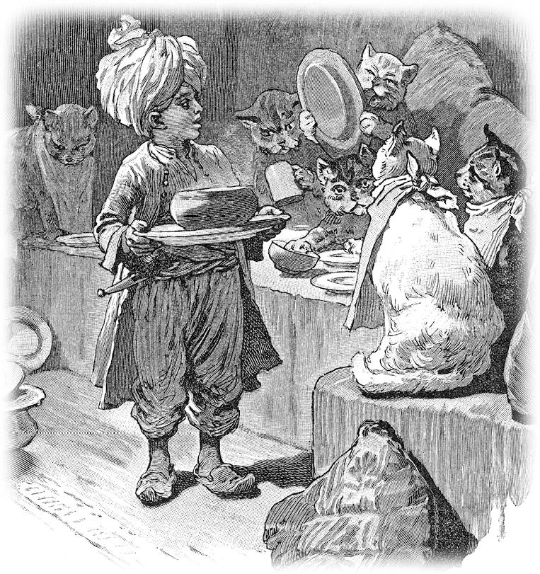 Дверь отворилась, и Мук увидел, что в дом вошло множество собак и кошек. Несколько минут он стоял в нерешительности, последовать ли ему приглашению, но наконец собрался с духом и пошёл в дом. Перед ним шли несколько молодых кошечек, и он решил следовать за ними, потому что они, может быть, знали кухню лучше его.