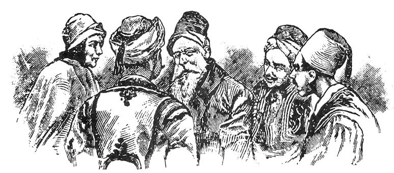 Так они крикнули, а старик заметил их знаки и подошёл к ним, узнав в них тех молодых людей, с которыми говорил несколько дней тому назад. Они обратили его внимание на приготовления в доме шейха и спросили его, не знает ли он, какого же высокого гостя ожидают.